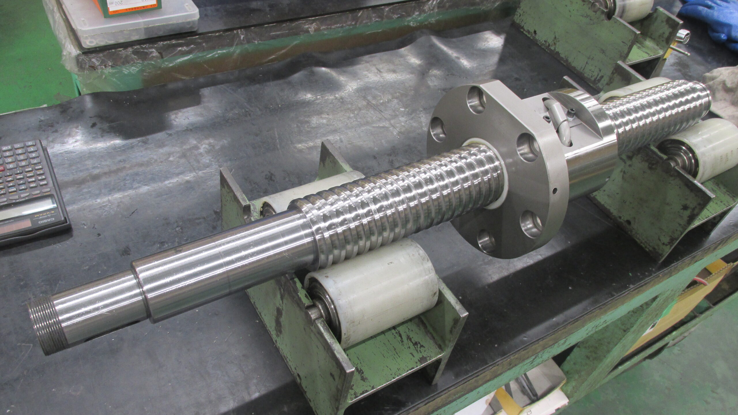 加工精度を上げるために、バックラッシュを解消する必要があります。そのために、ネジ溝のラッピング(=全周磨き)を行い全ストロークに予圧が掛かるよう調整し直しました。